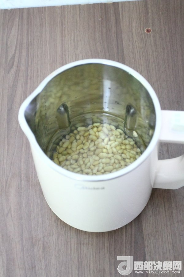 2、將浸泡過后的黃豆撈出放進豆?jié){機桶中,加入適量的水(以最低水位為準)。