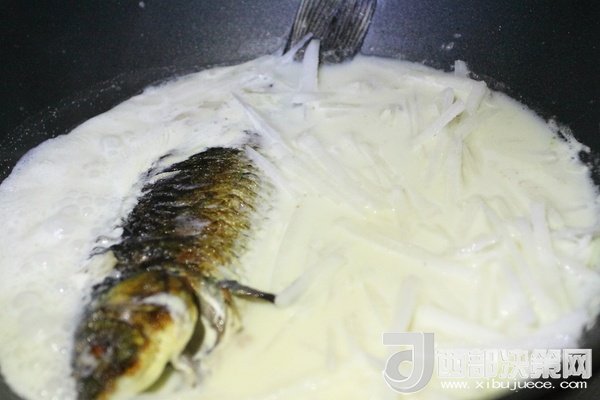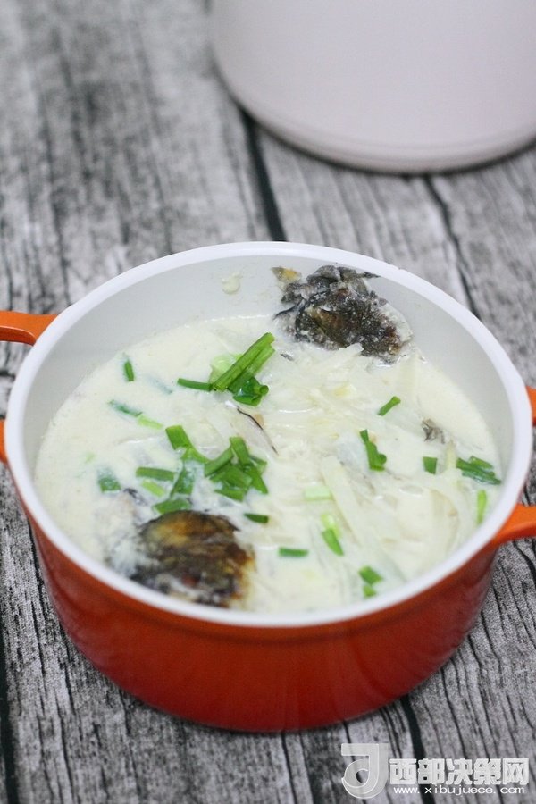 10、加入白蘿卜絲繼續(xù)中小火慢慢燉至湯汁變得更加濃稠和奶白狀態(tài)時出鍋,出鍋前5分鐘左右加入適量鹽調味,出鍋后撒上蔥花。