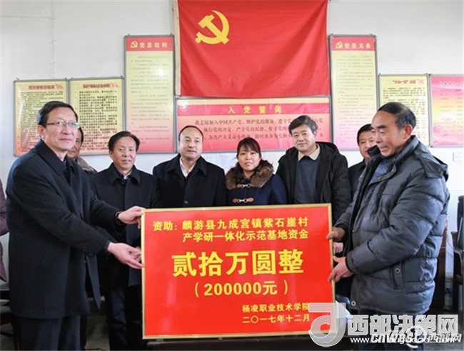 12月15日,為為貫徹落實 《全省脫貧攻堅 2017冬季行動方案》精神,扎實推進高校結(jié)對幫扶“雙百工程”,有效地為當(dāng)?shù)靥厣a(chǎn)業(yè)服務(wù),楊凌職業(yè)技術(shù)學(xué)院黨委書記趙曼、黨委副書記任得元一行來到麟游縣九成宮鎮(zhèn)紫石崖村,為該村捐贈20萬元,用于建立中蜂養(yǎng)殖產(chǎn)學(xué)研一體化示范基地、核桃豐產(chǎn)栽培產(chǎn)學(xué)研一體化示范基地及電商網(wǎng)絡(luò)平臺。