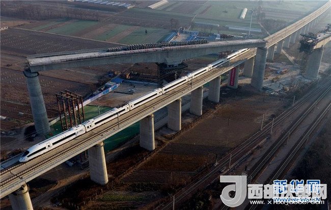 西成高鐵由西安北站駛出的列車(chē)經(jīng)過(guò)西成高鐵跨西寶高鐵特大橋(12月6日攝)。12月6日,西安至成都高速鐵路全線開(kāi)通運(yùn)營(yíng),兩地的最短旅行時(shí)間壓縮至4小時(shí)7分。