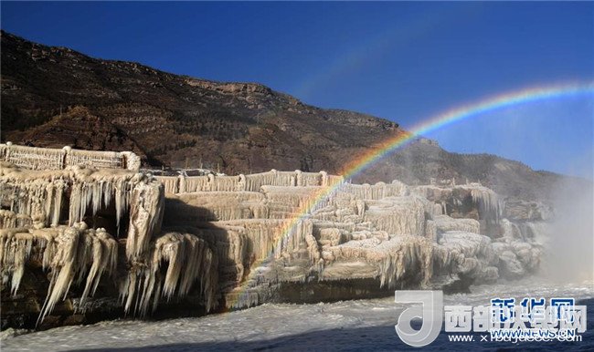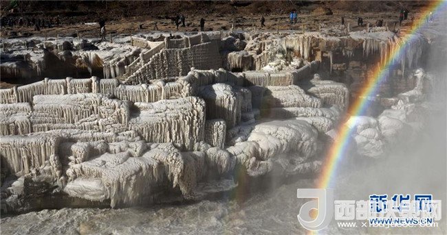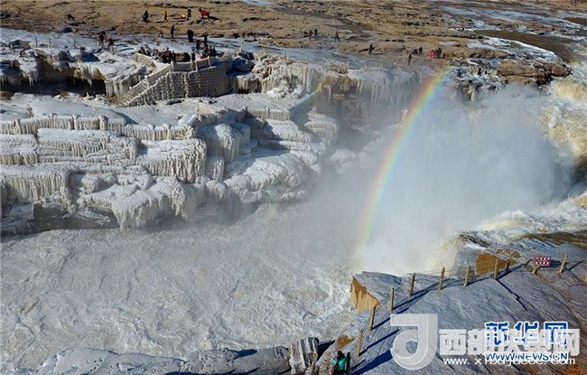 這是12月17日在山西吉縣黃河壺口瀑布拍攝的冰瀑彩虹景觀。當(dāng)日,黃河壺口瀑布出現(xiàn)彩虹景觀。壺口瀑布兩岸姿態(tài)萬(wàn)千的冰瀑,與瀑布上空的彩虹相映成趣,美不勝收。(呂桂明 攝)