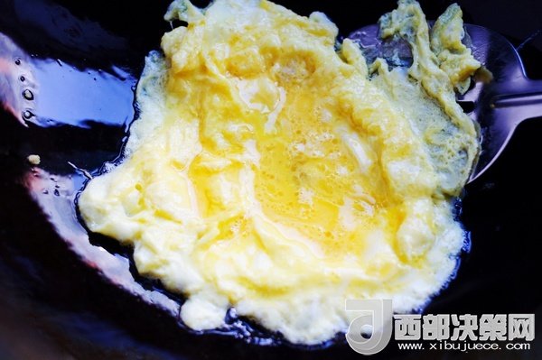 炒鍋里倒進(jìn)油,燒熱后倒入雞蛋液炒蓬松。