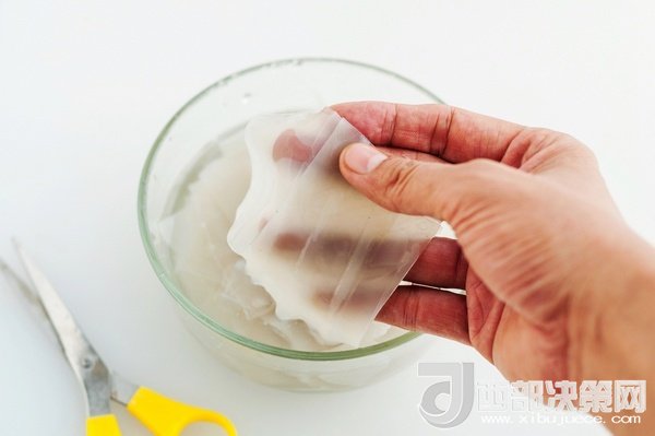 粉皮用清水泡軟,撕成大片。
