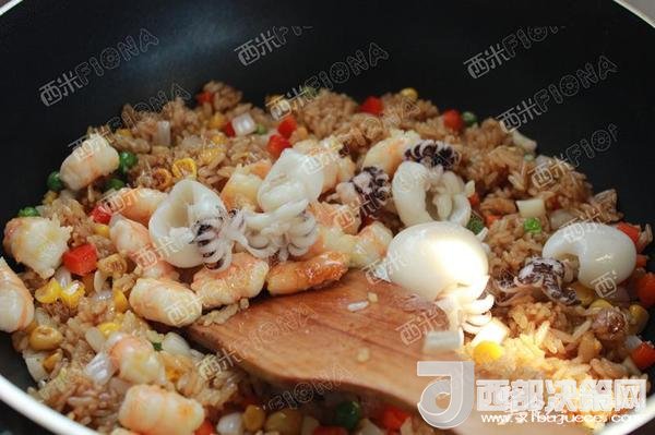 最后加入炒好的蝦仁,墨魚仔以及玉米青豆胡蘿卜等。再翻炒幾下。調入適量鹽。