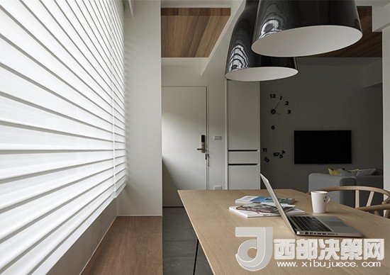 為了符合簡單純粹的設計理念,沒有電視柜的背景墻上放置了一個藝術(shù)時鐘,可移動的數(shù)字設計展現(xiàn)了一種道家的精神。