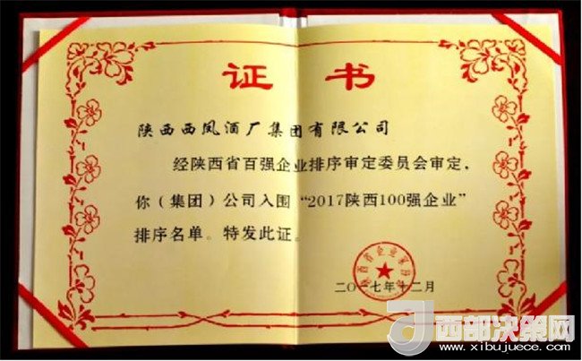 西部決策網(wǎng)-西部大開(kāi)發(fā)訊(韓宗憲)近日,“陜西百?gòu)?qiáng)企業(yè)”發(fā)布會(huì)在西安禹龍國(guó)際酒店隆重舉行。會(huì)上,陜西西鳳酒廠集團(tuán)公司再次蟬聯(lián)“2017陜西企業(yè)100強(qiáng)”光榮稱號(hào),西鳳公司副總經(jīng)理高洪濤代表企業(yè)領(lǐng)取了榮譽(yù)證書(shū)和獎(jiǎng)牌。