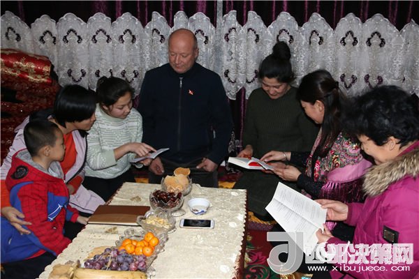午飯后,幾個(gè)老師幫忙收拾完,就和蘇爾婭的爸媽在客廳聊天。一個(gè)下午,從蘇爾婭的學(xué)習(xí)聊到家里情況。老師們還拿出隨身攜帶的《黨的十九大報(bào)告學(xué)習(xí)輔導(dǎo)百問(wèn)》和《十九大報(bào)告應(yīng)知應(yīng)會(huì)》小冊(cè)子,與蘇爾婭一家人一起學(xué)習(xí)十九大精神。2017年以來(lái),吐?tīng)柕毓披愒诖謇锩刻焐弦剐W(xué)漢語(yǔ),她利用這個(gè)難得的機(jī)會(huì)向老師們請(qǐng)教漢語(yǔ)學(xué)習(xí)方面的問(wèn)題。