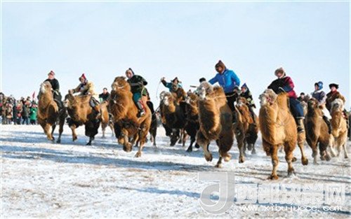 這邊還沒有欣賞完駱駝的高大靜美,馬隊的馳騁再次讓觀眾熱血沸騰。一縱疾馳的駿馬驕傲地?fù)P著頭顱,鬢毛高高飛起,厚重的積雪并沒有減慢馬兒奔跑的速度,雪團如碎銀一般在它們腳下飛灑,而騎手們紅綠藍(lán)各異的蒙古皮袍也分外吸引眼球。緊接著還有射箭、駱駝拉爬犁等精彩表演。