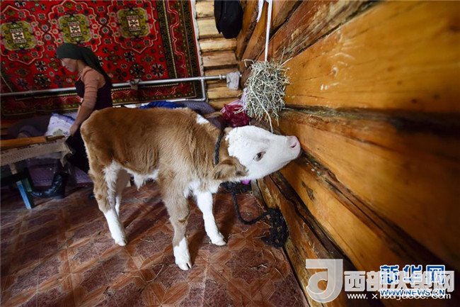 在新疆喀納斯禾木村美麗峰腳下的“迪娜小屋”里,放養(yǎng)著一頭剛出生十幾天的小牛犢(1月2日攝)。記者 趙戈 攝