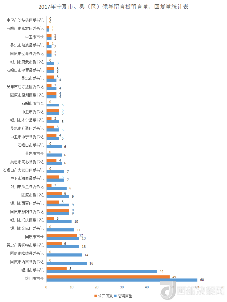 銀川市市長(zhǎng)、銀川市委書記、固原市西吉縣委書記的留言量分別以60、44、16條進(jìn)入前三名。盡管網(wǎng)民給固原市西吉縣委書記的留言量進(jìn)前三,但回復(fù)量卻為0。