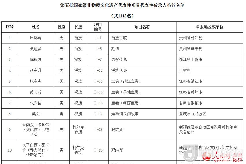 在各地推薦申報(bào)的基礎(chǔ)上,各評(píng)審組專家對(duì)全國(guó)31個(gè)?。▍^(qū)、市)、新疆生產(chǎn)建設(shè)兵團(tuán)、中央有關(guān)部門(mén)及港澳地區(qū)推薦的申報(bào)人進(jìn)行了評(píng)審,經(jīng)評(píng)審委員會(huì)審議,提出了第五批國(guó)家級(jí)非物質(zhì)文化遺產(chǎn)代表性項(xiàng)目代表性傳承人推薦名單(共1113人)。其中對(duì)尚未認(rèn)定過(guò)國(guó)家級(jí)代表性傳承人的項(xiàng)目,本次推薦827人,對(duì)已認(rèn)定過(guò)國(guó)家級(jí)代表性傳承人的項(xiàng)目,本次推薦286人。