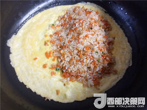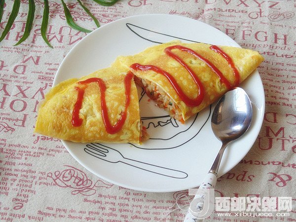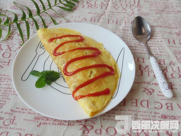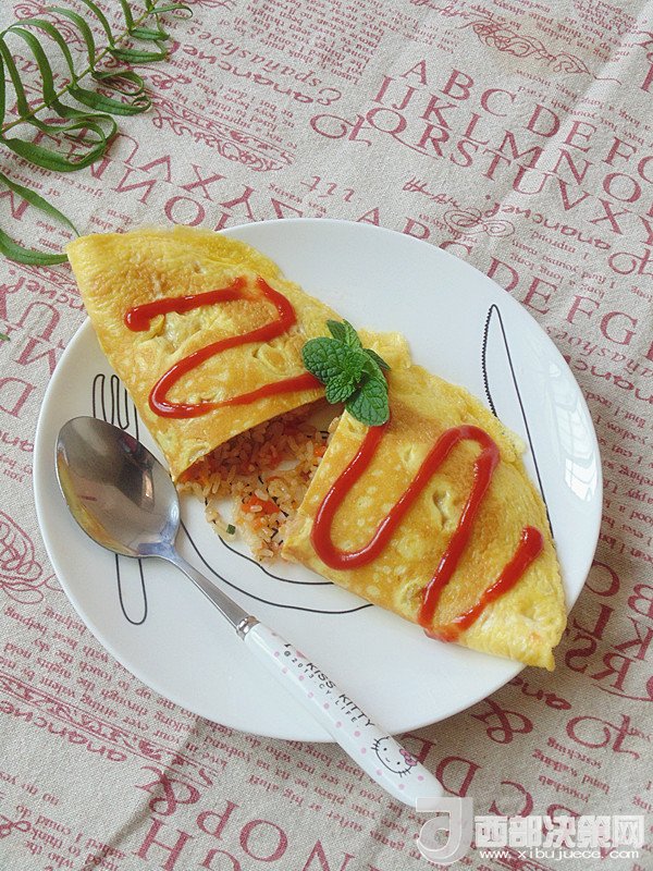 14.將炒好的飯倒入煎好蛋皮的一側,另一邊折過來邊緣對齊。擠上番茄沙司裝飾即可開吃。