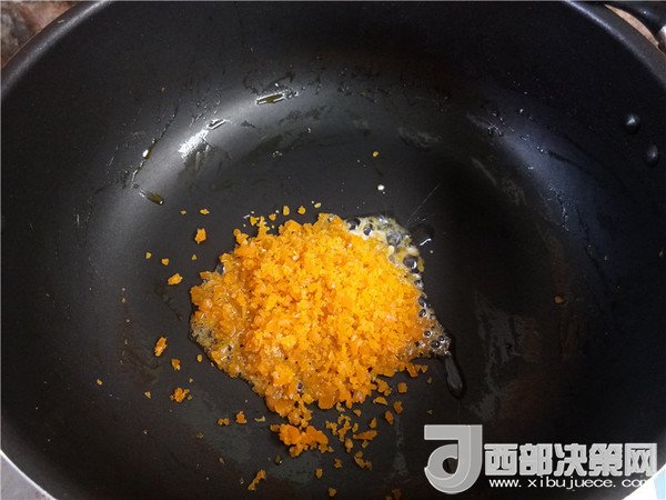 3.將胡蘿卜切成小丁、蔥切成蔥花、咸蛋碾成碎末。
