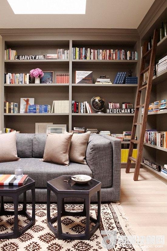 把全部的墻面都用來打造書架,用成摞的書本塞得滿滿當(dāng)當(dāng),充實感油然而生。高處的書本也不怕夠不到,只要有一把梯子就能解決問題。