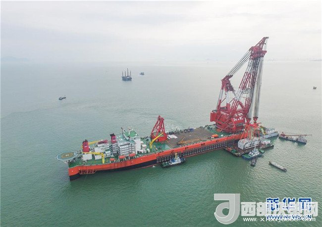 “振華30”起重船吊起重港珠澳大橋島隧工程海底隧道的最終接頭,準備放置到預(yù)定位置(2017年5月2日攝)。 記者 劉大偉 攝