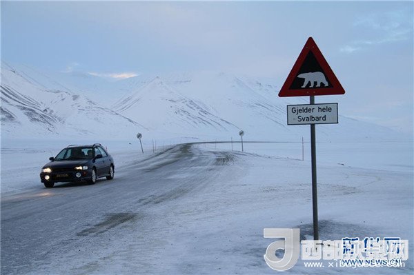 2月25日,在挪威斯瓦爾巴群島首府朗伊爾城,一輛汽車從提示北極熊出沒的警示路標(biāo)旁駛過。記者梁有昶攝