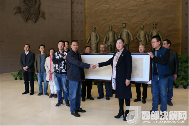 西部決策網(wǎng)——西部大開發(fā)訊(帥華鋒 通訊員 柴金霞 陳彥榮)“三月的南梁,大地處處蕩漾著春的漣漪.....”在這生機勃勃、春意盎然的美好時節(jié),中國書法家協(xié)會會員、首屆《世界華人運動大會書畫展》楷書評委、清心齋主人趙倉老師一行,帶著對革命老區(qū)的深情厚誼和對劉志丹、謝子長、習仲勛等革命先輩舍生忘死、救民出水火的崇敬之意來到革命圣地——南梁,向紀念館捐贈書法作品《長恨歌·習仲勛》。本作品系趙倉老師艱辛創(chuàng)作的佳品力作,飽含了趙倉老師豐厚的文化內(nèi)涵,真實再現(xiàn)了習仲勛老人不畏艱難、矢志堅守的人生壯麗詩篇。
