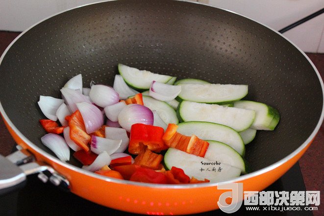 10.熱鍋,倒入橄欖油,放入洋蔥、辣椒、節(jié)瓜煸香炒熟起鍋;