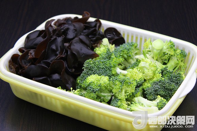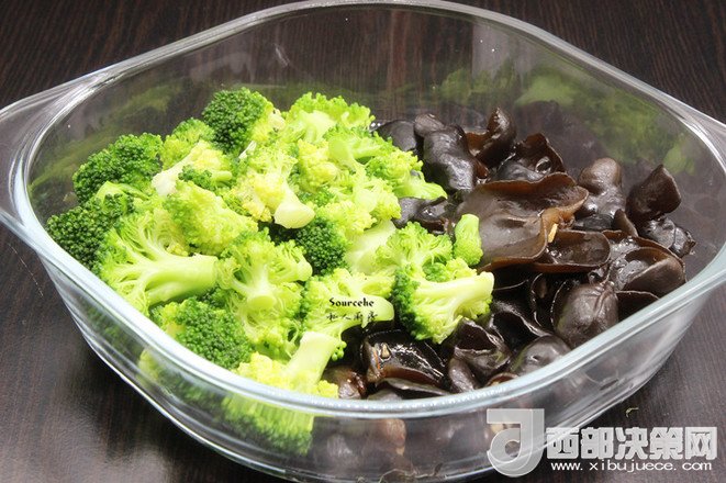 2.木耳浸泡,洗凈,撈出瀝干水,西蘭花洗凈切小朵;