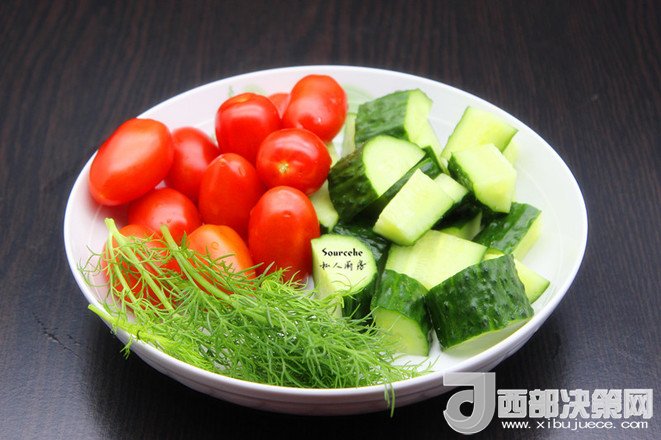 4.小番茄洗凈去蒂,瀝干水;青瓜,洗切塊,茴香、香蔥、洗凈;