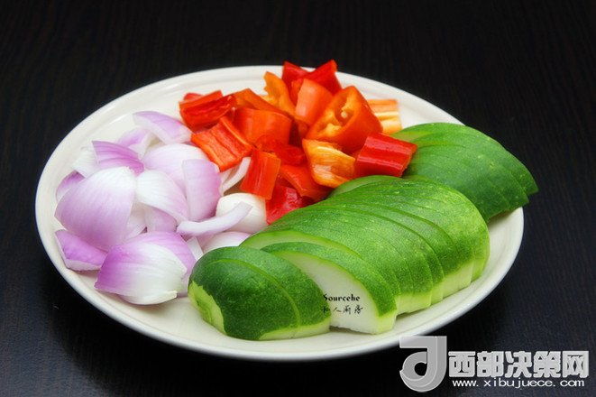 3.洋蔥洗凈切塊;節(jié)瓜,洗凈切片;辣椒去蒂、去籽,切塊;
