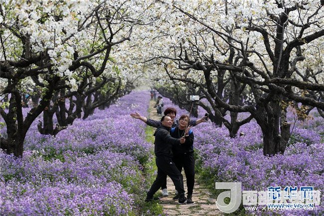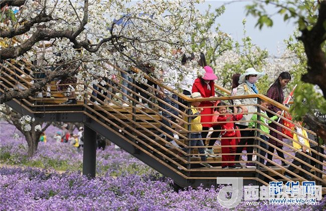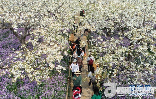 清明時節(jié),在江蘇省宿遷市三臺山森林公園梨香滿園景區(qū),白色的梨花和紫色的二月蘭爭相綻放,吸引眾多游客前來踏青賞花。 新華社發(fā)(周國強 攝)