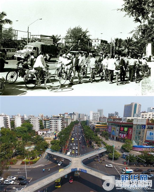 拼版照片為??谑泻8方裎魧?duì)比(上圖為1988年12月新華社記者姜恩宇攝,下圖為2018年4月14日新華社記者郭程攝)。
