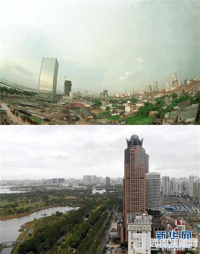 拼版照片為海口市濱海大道南側(cè)的建筑物今昔對(duì)比(上圖為1990年1月10日新華社記者姜恩宇攝,下圖為2018年4月15日新華社記者趙穎全攝)。