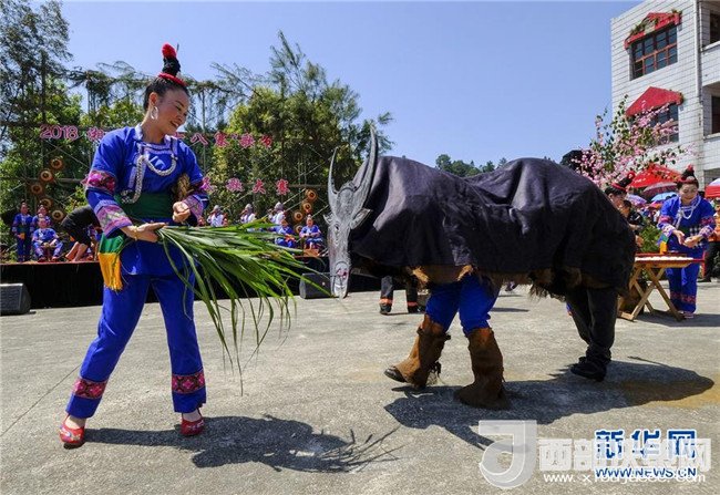 4月18日,在貴州省天柱縣坌處鎮(zhèn),人們表演農(nóng)耕場(chǎng)景慶祝“三月三”。新華社發(fā)(龍勝洲 攝)