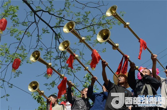 4月18日,在湖南省吉首市丹青鎮(zhèn)錦坪村,人們?cè)?ldquo;三月三”盛會(huì)上吹奏甲馬號(hào)。新華社發(fā)(姚方 攝)