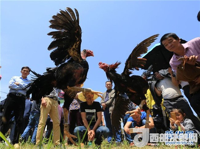 4月18日,在廣西柳州市融水苗族自治縣三防鎮(zhèn),人們?cè)趹c祝“三月三”的活動(dòng)上斗雞。新華社發(fā)(龍濤 攝)