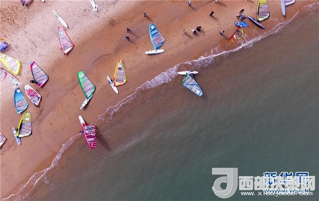在三亞蜈支洲島參加2016動(dòng)力沖浪板國(guó)際賽中國(guó)站的選手在比賽中(2016年9月18日無(wú)人機(jī)拍攝)。新華社記者 楊冠宇 攝