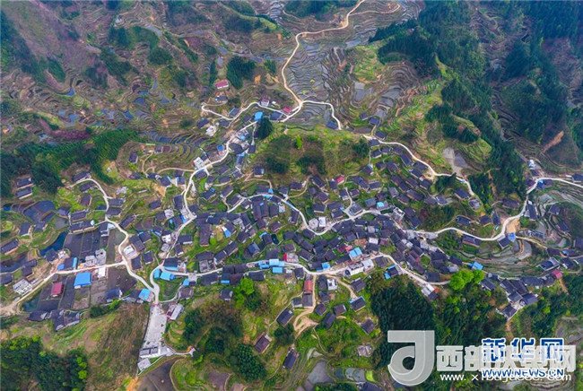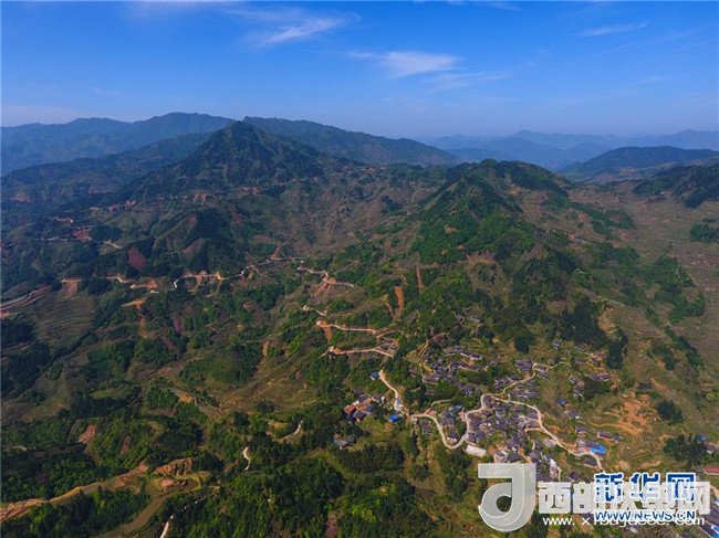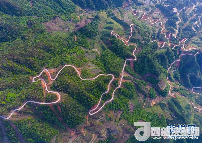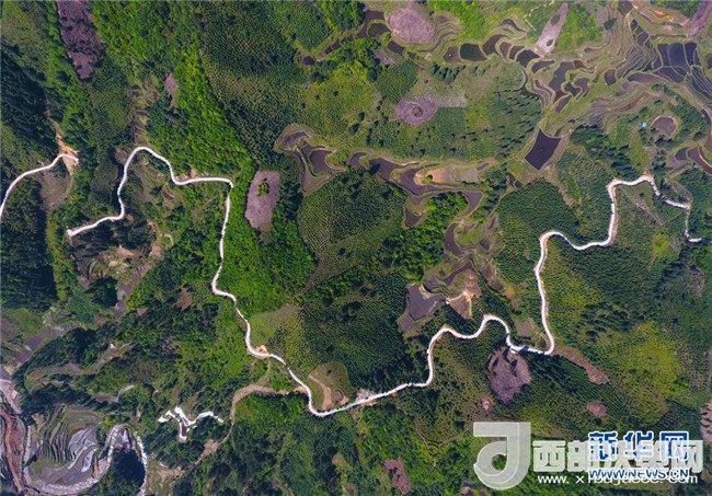 這是借助無(wú)人機(jī)拍攝的融水苗族自治縣桿洞鄉(xiāng)錦洞村公路(4月17日攝)。