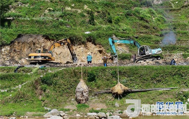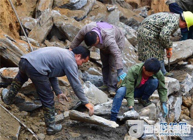 工人在融水苗族自治縣桿洞鄉(xiāng)黨鳩村烏英屯修路(4月17日攝)。