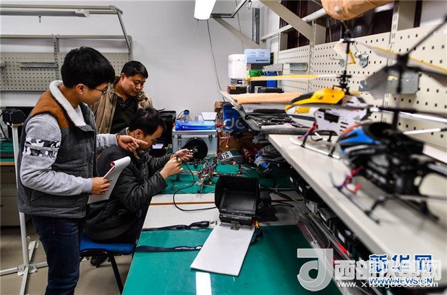 黃大年團(tuán)隊成員在實驗室內(nèi)調(diào)試、組裝無人機(jī)(2017年2月9日攝)。