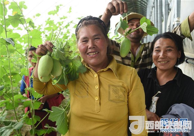 新疆和田市金葉村貧困戶吐尼亞孜·阿布都卡地爾(前左)在北京援建的大棚里展示剛從瓜藤上疏減下來(lái)的多余甜瓜(4月18日攝)。