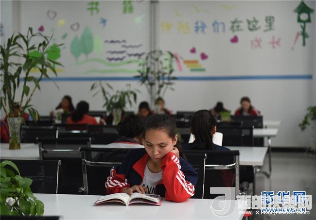在北京援建的墨玉縣北京中學(xué)校園里,學(xué)生在圖書(shū)館里閱讀(4月20日攝)。