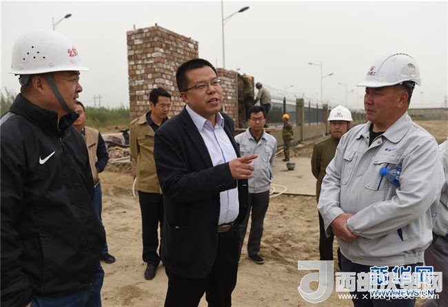 北京援疆干部、墨玉縣委副書(shū)記張好生(中)在墨玉縣北京工業(yè)園區(qū)紡織園建設(shè)現(xiàn)場(chǎng)與施工方交談(4月20日攝)。