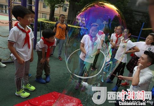 孩子們體驗被泡泡罩住的感受?!°蟛?攝