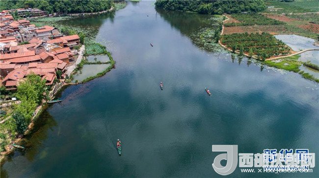 游人在普者黑國(guó)家濕地公園蕩舟休閑、觀賞美景(5月26日無(wú)人機(jī)拍攝)。