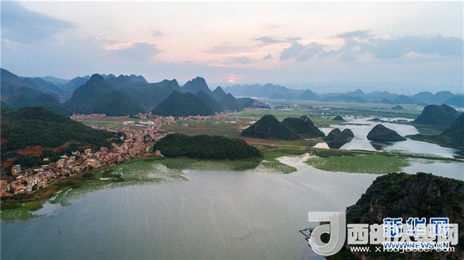 這是5月26日無(wú)人機(jī)拍攝的普者黑國(guó)家濕地公園日落一景。