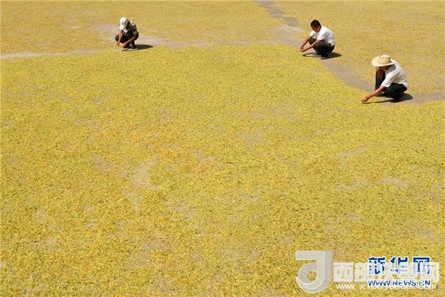 5月27日,河北省吳橋縣鐵城鎮(zhèn)雙井王村農民晾曬金銀花。