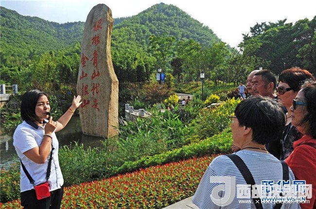 6月3日,安吉縣余村農(nóng)家女導游潘春連(左一)向游客介紹當?shù)?ldquo;美麗鄉(xiāng)村”景色。新華社記者 譚進 攝