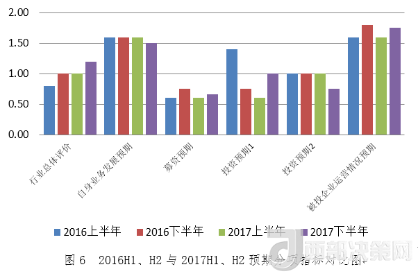 相較于募資、投資、退出指標的微降,機構(gòu)信心指標上漲顯示投資人對2018年北京地區(qū)股權(quán)投資發(fā)展充滿了信心。從預(yù)期分項指標看,雖然指標所處水平顯示投資人認為2018年上半年行業(yè)總體仍將保持平穩(wěn)發(fā)展態(tài)勢,對自身業(yè)務(wù)發(fā)展預(yù)期、募資預(yù)期、投資預(yù)期保持中性,但是行業(yè)總體評價、被投企業(yè)運營情況預(yù)期、募資預(yù)期、投資預(yù)期這四個指標均較上期有所增長,而自身業(yè)務(wù)發(fā)展預(yù)期指標和投資預(yù)期指標較上期有所下降,綜合顯示投資人對行業(yè)和自身業(yè)務(wù)發(fā)展謹慎樂觀的態(tài)度。