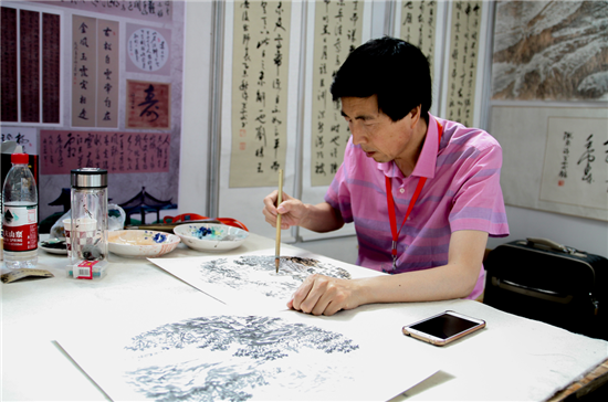 甘肅畫家盧旭東正在展會(huì)中心書畫展區(qū)創(chuàng)作國(guó)畫
