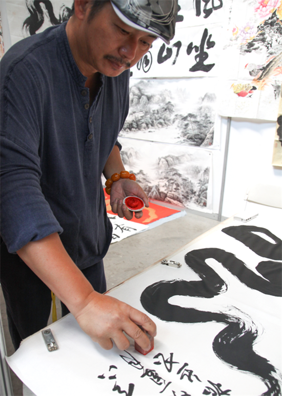 中華一筆龍?jiān)S超然正在為一幅剛剛創(chuàng)作完成的書法作品落款蓋章