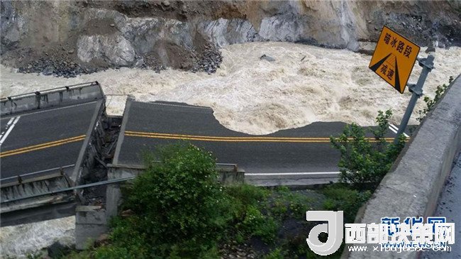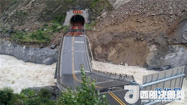7月13日在四川茂縣國道213線疊溪隧道旁拍攝的垮塌橋梁。記者從當(dāng)?shù)亟煌ú块T獲悉,7月13日凌晨5點左右,受持續(xù)強(qiáng)降雨帶來的水位上漲影響,在四川省阿壩藏族羌族自治州茂縣境內(nèi),國道213線汶川至川主寺公路K759+550米處、疊溪隧道旁一座跨越岷江的隧道連接橋垮塌,導(dǎo)致道路中斷。由于此前已經(jīng)對車輛限行,垮塌時無車輛通過,無人員傷亡。當(dāng)?shù)叵嚓P(guān)部門正密切監(jiān)測該橋梁狀態(tài),避免發(fā)生次生災(zāi)害。新華社發(fā)