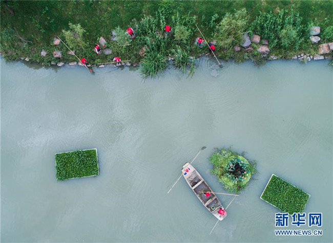 在浙江省長興縣劉家渡河道南太湖段,河長帶領專職保潔人員進行日常鄉(xiāng)村河道護理(2017年10月13日無人機拍攝)。