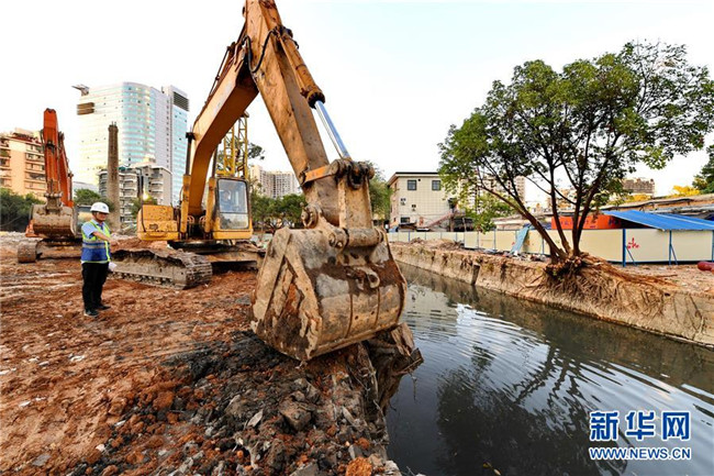 福建省福州市鼓臺中心區(qū)水系綜合治理點達道河河長溫水林在指揮工人進行河道新建截污管的回填(2017年10月11日攝)。