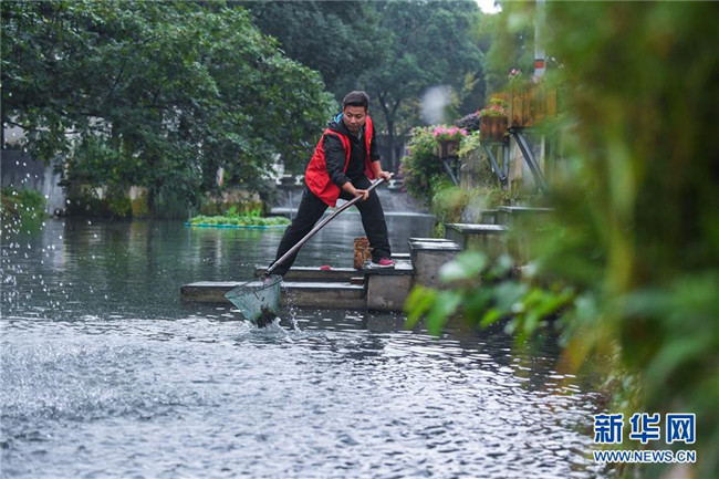 在浙江省長興縣龍山街道渚山村車渚港河道內,河長王佳進行日常鄉(xiāng)村河道護理巡查(2017年10月12日攝)。